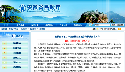 5月12日,凤凰安徽从安徽省民政厅官网获悉,为贯彻落实《安徽省人民政府办公厅关于进一步动员社会各方面力量参与扶贫开发的实施意见》,进一步动员、支持和鼓励社会组织参与扶贫开发,近日安徽省民政厅、安徽省扶