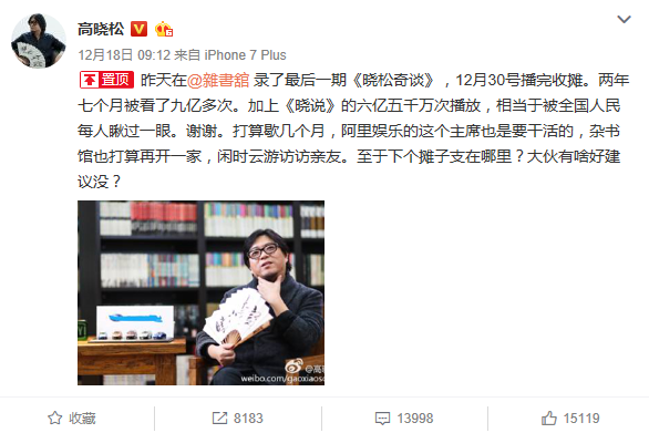 12月18日,高晓松在发微博宣布,周播文化类脱口秀节目《晓松奇谈》明年将停播。