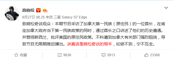 2016年8月,高晓松发表微博致歉晓松奇谈观众,表示自己的节目因遭到“加拿大有关部门强烈阻挠,导致节目无限期推迟播出”。